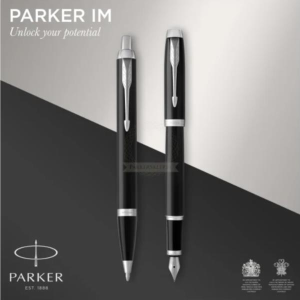Elegante set in confezione regalo che comprende penna a sfera M IM Black CT + stilografica M IM Black. Realizzate in acciaio inox con eleganti dettagli cromati. Dotate dell'iconica clip a freccia Parker. Fornite con refill colore blu.