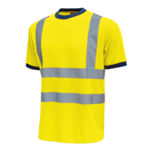 T-Shirt con strisce riflettenti applicate. Collo e bordo manica in costine elasticizzate in colore blu. Fettuccia parasudore. La composizione del tessuto garantisce una buona traspirabilità aumentando il comfort. Conformità alle norme EN ISO 13688:2013 e EN ISO 20471:2013+A1:2016.