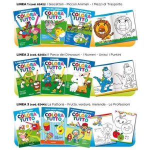 COLORA TUTTO LINEA 3 FORMATO A4 24 PAGINE 120 GR CONFEZIONE DA 6 SOGGETTI ASSORTITI (LA FATTORIA/FRUTTA VERDURA MEREND/LE PROFESSIONI)