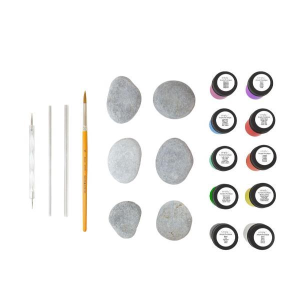 DALER ROWNEY SIMPLY ROCK PAINTING KIT CREATIVO CON 10 COLORI ACRILICI DA 18 ML 1 PENNELLO 1 PENNA DOPPIA PUNTA 2 BASTONCINI PER PUNTEGGIATURA E 6 PIETRE