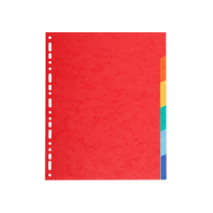 Divisori in cartoncino riciclato (certificazione Blue Angel) da 220 gr. Dotati di 6 tasti neutri colorati (colori assortiti). Perforazione universale. Formato esterno: 24,2x29,7 cm.