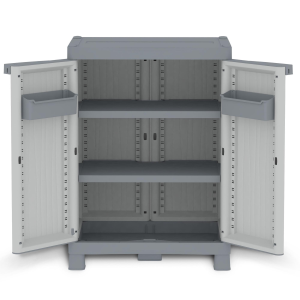 Armadio a 2 ante con 2 ripiani regolabili e 2 vaschette. Possibilità di chiusura con lucchetto ( non incluso). Dimensioni: 70x43,8x97,6 cm