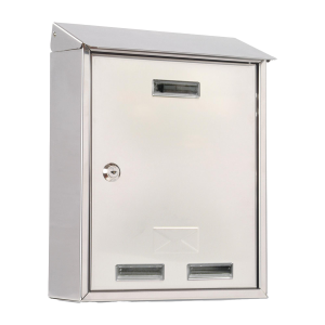 Cassetta postale Elios in acciaio inossidabile tipo 430 2B/SB ricoperto di pellicola bassa adesività (da rimuovere) con tetto antipioggia e serratura a chiave cifrata. Si consiglia di non esporre la cassetta direttamente alle intemperie e di non installarla in zone di mare in quanto potrebbe arrugginirsi.
